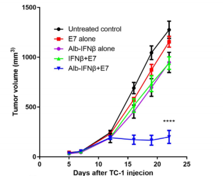 在腫瘤的治療中,利用HSA載藥可以顯著提高腫瘤細胞中藥物的分布,提高藥物靶向性。此外,HSA還具有其他優勢:1)與藥物融合可延長肽類藥物的半衰期,減少用藥劑量和藥物副作用,減少患者用藥次數;2)提高黏蛋白的分泌量,用于滴眼液治療干眼癥;3)與膠原蛋白結合制成止血材料,不僅能結合、運輸藥物,還使止血材料增加了修復組織功能的作用;4)與聚乙二醇制成水凝膠,可用于外科手術中;5)與粒細胞集落刺激因子形成融合蛋白,可大大延長其半衰期[3-5]。Ssu-Hsueh Tseng,等[6]就報道了一種白蛋白與干擾素β的融合蛋白,與抗原多肽HPVE7展現出優秀的腫瘤生長抑制能力,同時大大延長了藥物的在體內的有效時間,達到長時間抑制腫瘤發育的作用(圖1)。