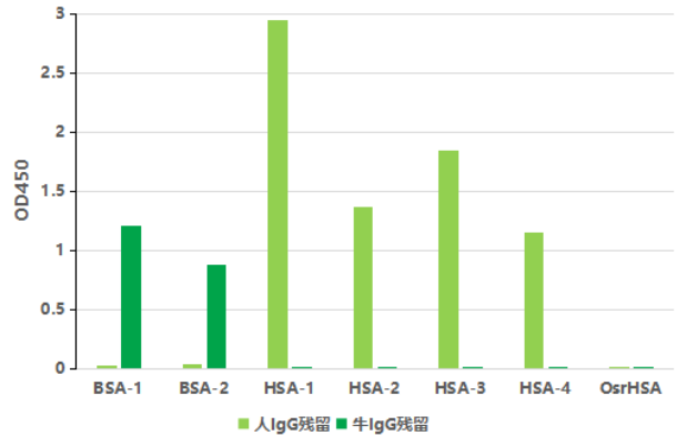 禾元生物的植物源重組人血清白蛋白OsrHSA來源于水稻,可杜絕傳播血源性病毒的潛在風險,比血漿來源的人血清蛋白更安全;同時,人類接觸和食用大米(水稻)具有幾千年歷史,與水稻內源蛋白具有長期接觸史,對稻米的雜質蛋白具有很高的耐受性和相容性,免疫原性較低,比其他表達體系更安全。由于禾元生物的輔料級人血清白蛋白不來源于血液,因此完全不含有血液蛋白殘留,例如血液中常見的免疫球蛋白,它的存在在藥用輔料中將成為潛在致敏源,同時也可能對藥品制劑產生影響的風險。雖然市售天然蛋白利用純化工藝將其大部分去除,但仍有一定殘留,禾元生物的OsrHSA使用IgG ELISA檢測則沒有檢出IgG殘留(圖2)