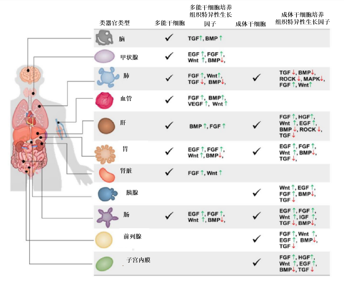 成功建立類器官的關鍵,除了所需的生物材料基質外,生長因子作為細胞培養、增殖及分化所必需的物質也必當優先考慮,從而保證類器官中的干細胞長期生存的能力。通過優化培養物生長條件模擬生理組織自我更新或損傷修復過程中的干細胞巢環境,如提供基底膜基質(即Matrigengel)并添加一系列激動劑(如Wnt和酪氨酸激酶受體)和抑制劑(如骨形態發生蛋白/轉化生長因子-β)可達到上述目的。不同的生長因子組合也能誘導多能干細胞向不同的類器官細胞分化進而獲得我們需要的類器官類型(圖1),同時不同的細胞因子也是培養不同種類的類器官的關鍵物質(圖2)。