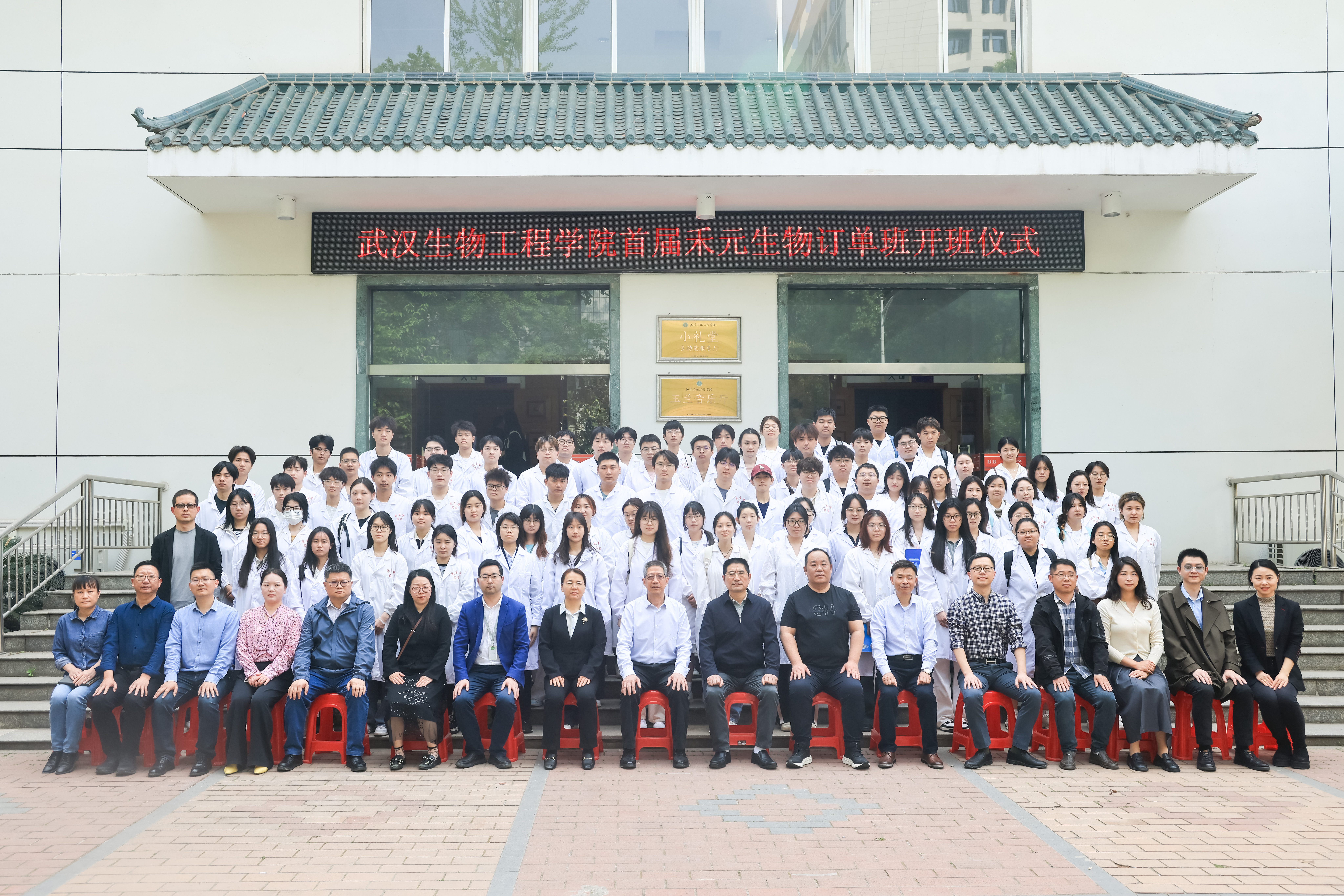會(huì)前,禾元生物團(tuán)隊(duì)與校領(lǐng)導(dǎo)、教師代表及首屆禾元生物訂單班學(xué)員在小禮堂西門臺(tái)階合影留念,記錄這一重要時(shí)刻。